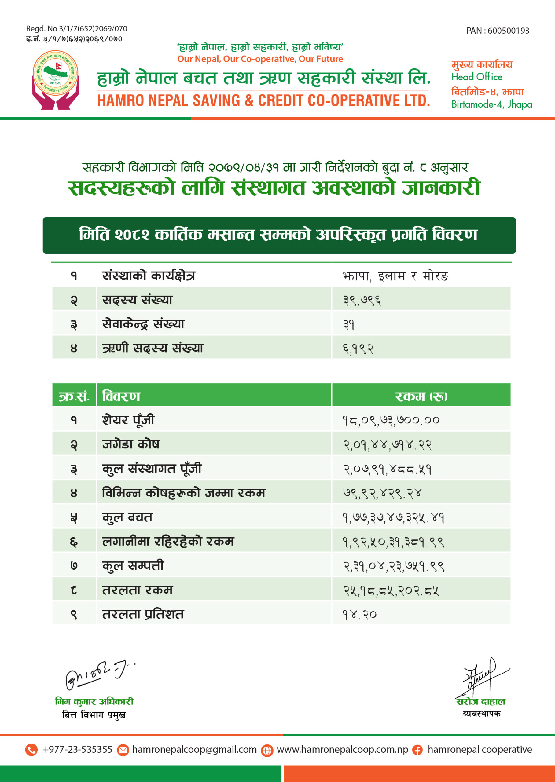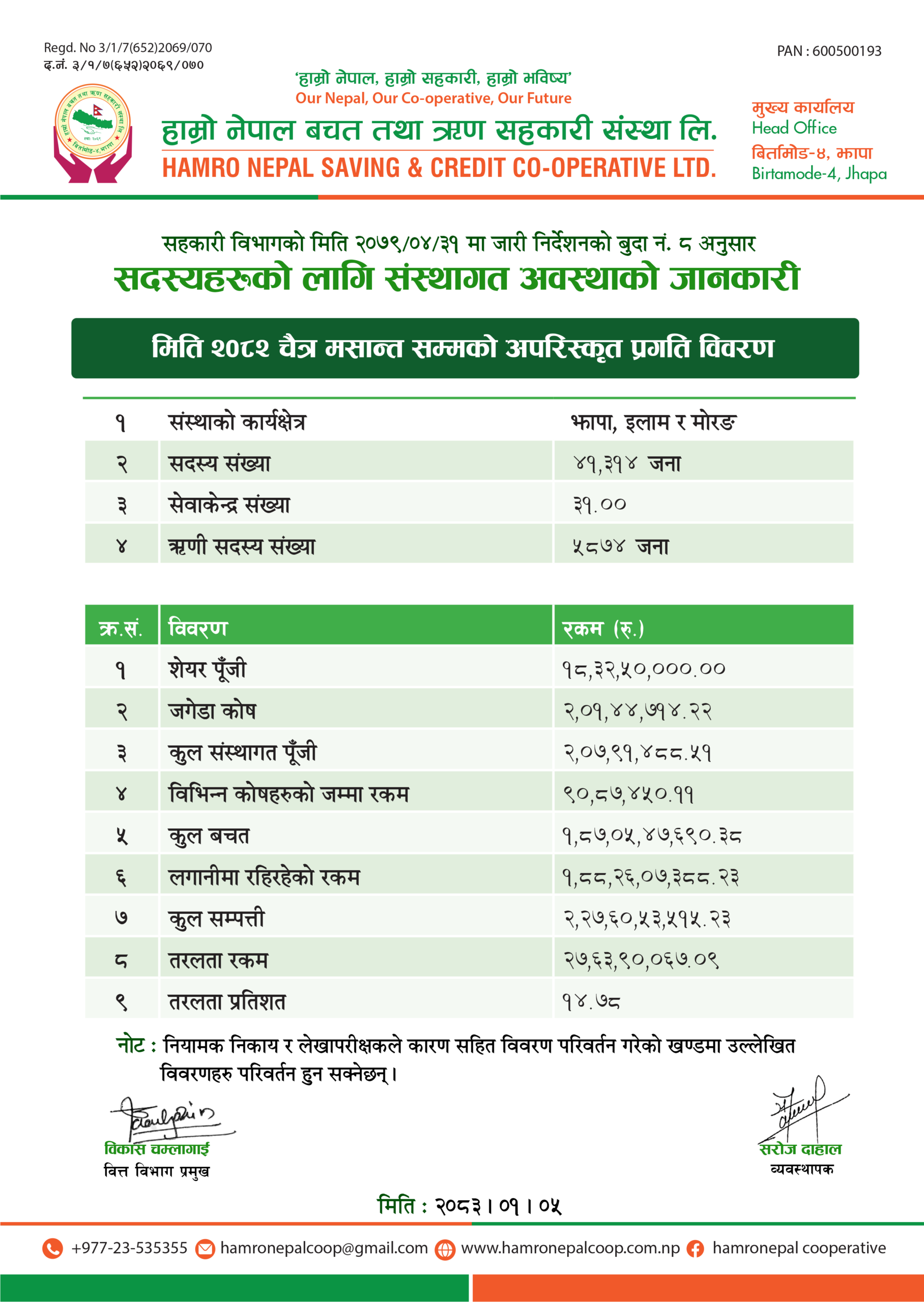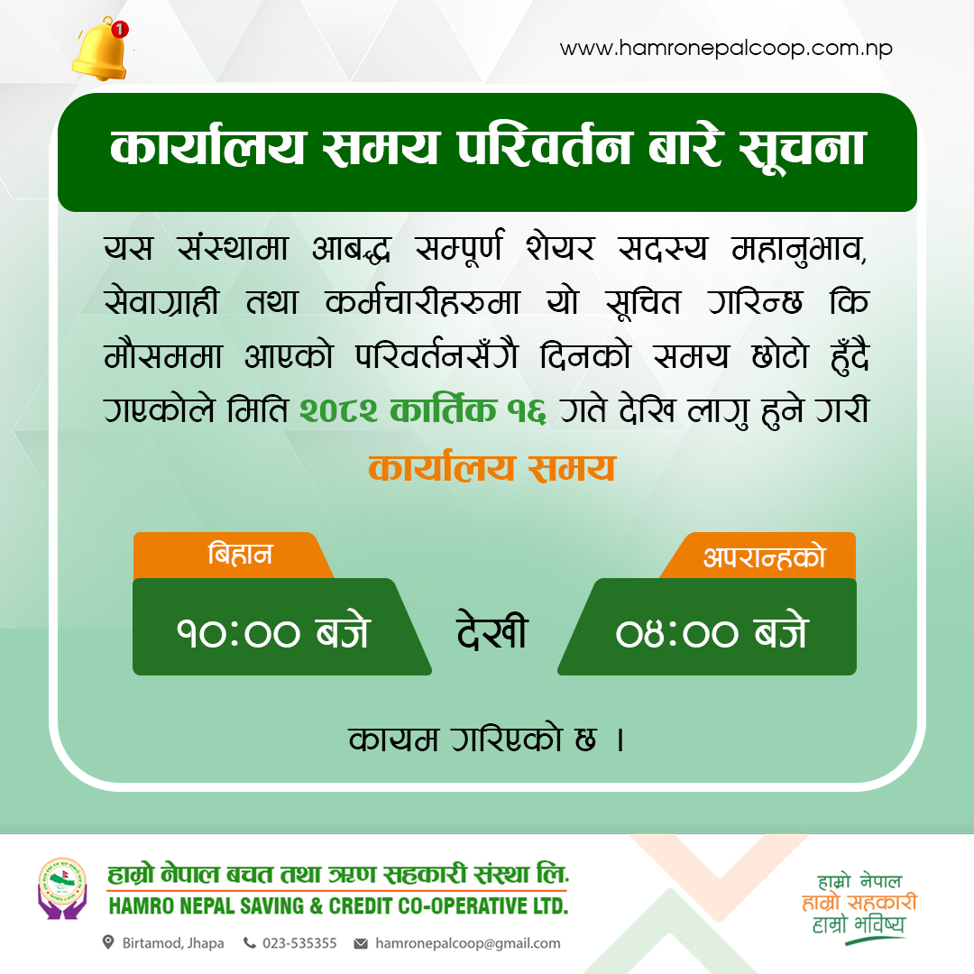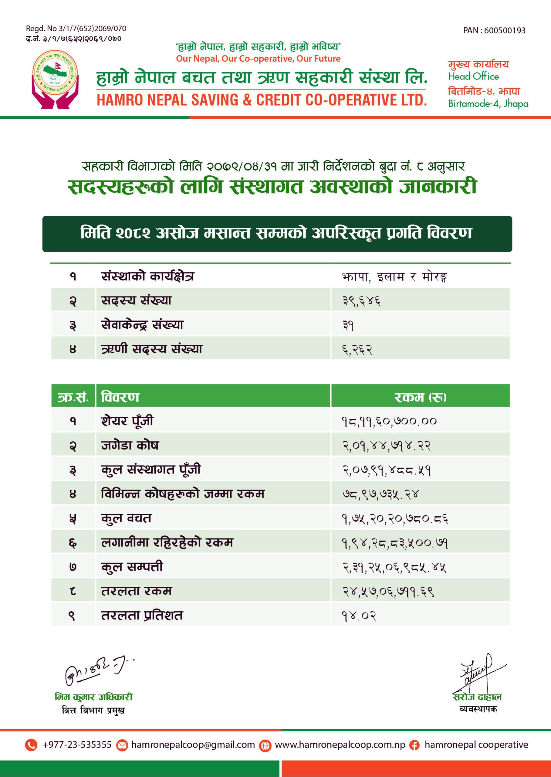 Hamro Nepal Savings and Credit Cooperative Ltd. Birtamod Municipality Ward No. 4 established under Jhapa Cooperative Act 2048 and Cooperative Rules 2049 on 14th Shrawan 2069 duly registered by Division Cooperative Office Bhadrapur Jhapa with the Registration No. 3/1/7 (652) 069/070. The three pillars of economic development adopted by the country are government, private and cooperatives. In an environment where the cooperative sector is being accepted as the backbone of economic development by the state, we are using the opportunities provided by it to reduce the economic deprivation in the society by making members of different castes, regions, classes to made them self-employed & self reliant. This organization has been established with the main slogan of "Our Nepal, Our Cooperative, Our Future" with the objective of helping to become self-reliant and for the greater good of its members.