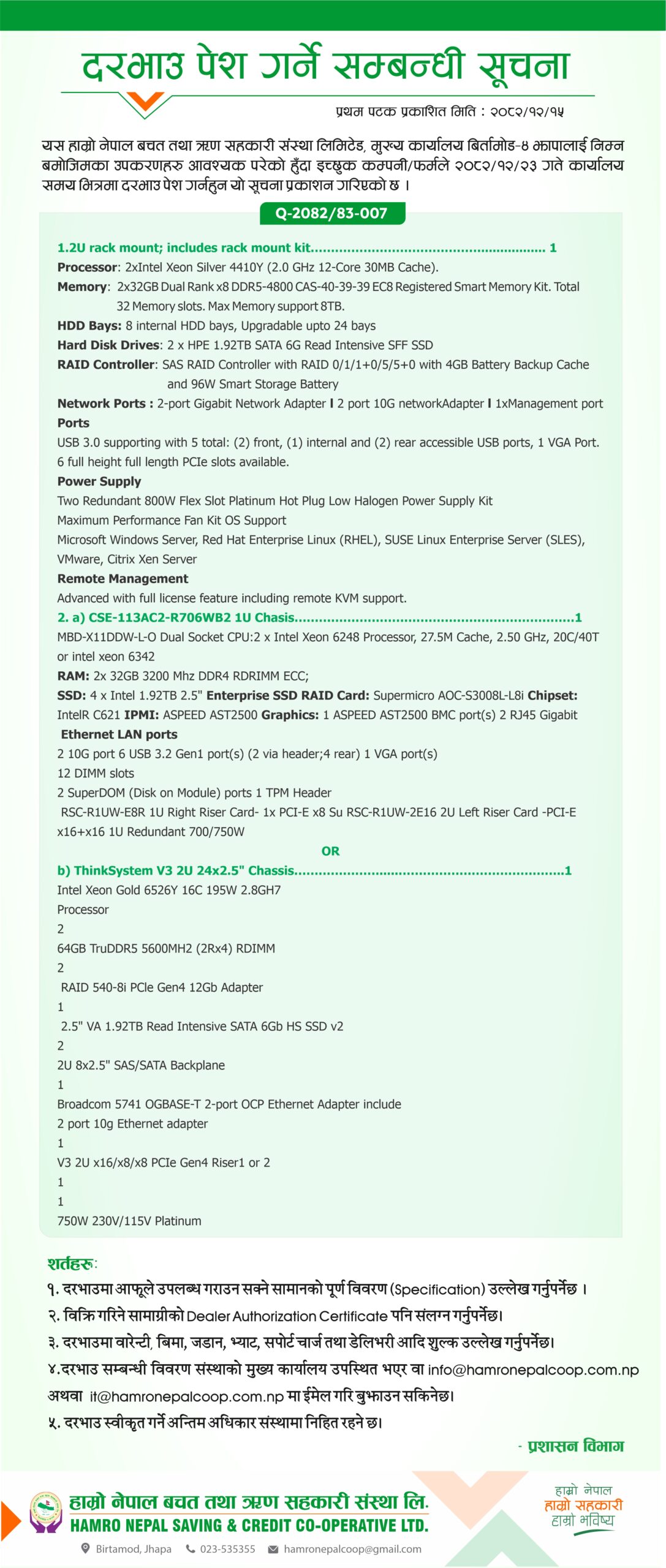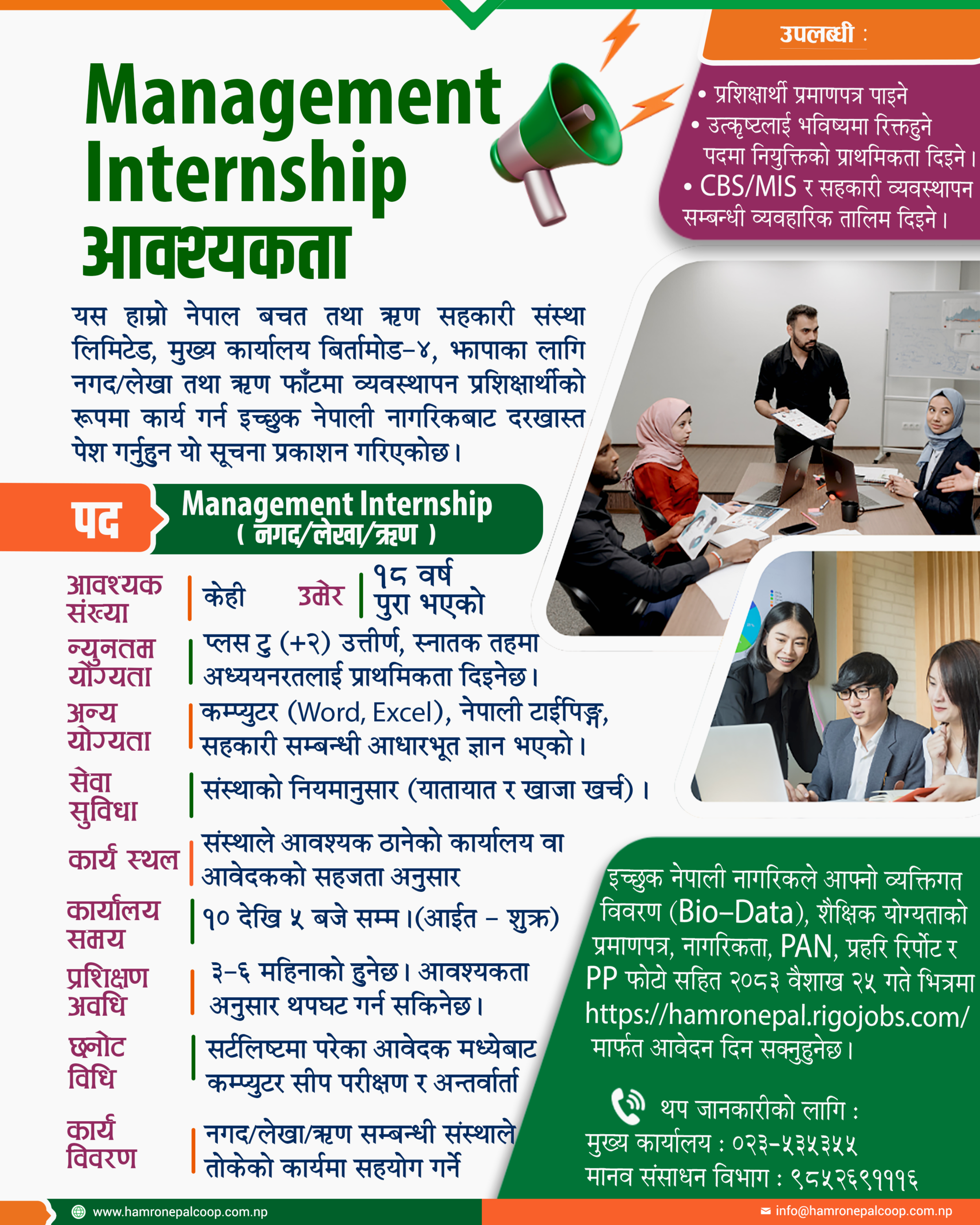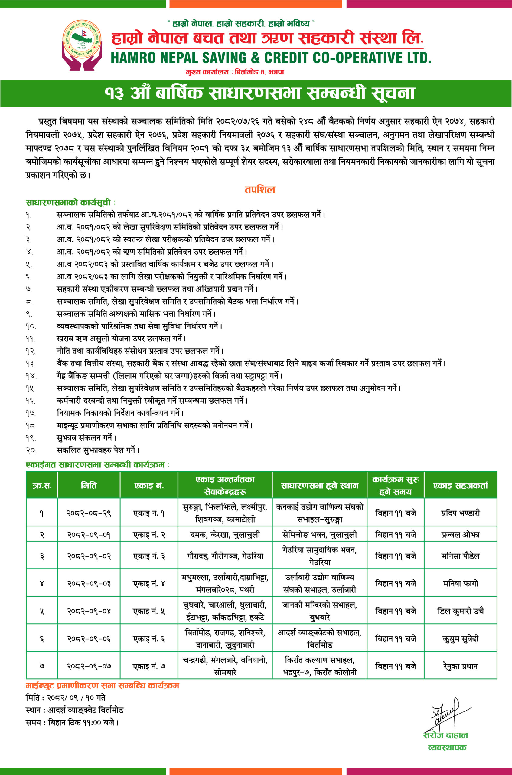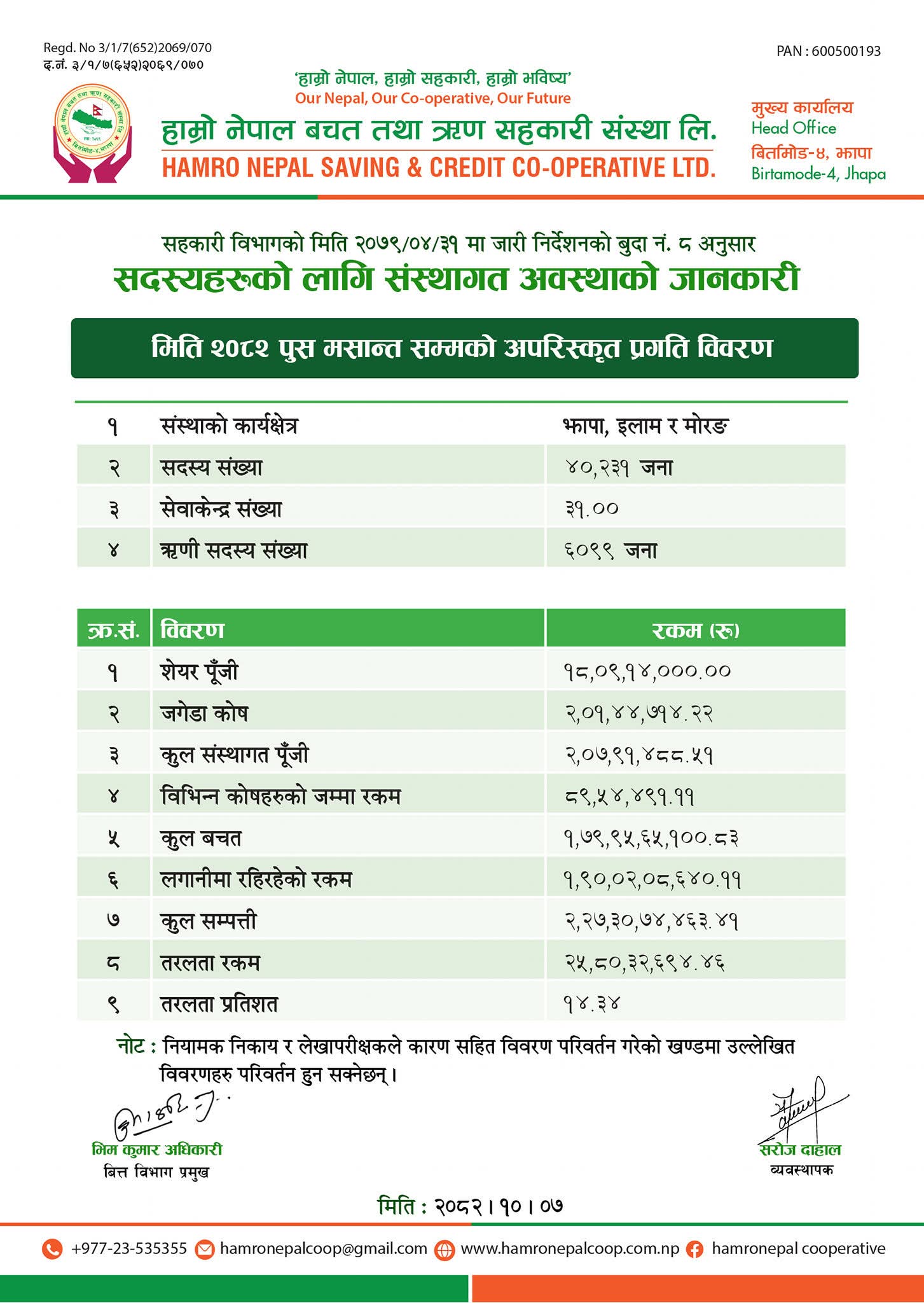 Hamro Nepal Savings and Credit Cooperative Ltd. Birtamod Municipality Ward No. 4 established under Jhapa Cooperative Act 2048 and Cooperative Rules 2049 on 14th Shrawan 2069 duly registered by Division Cooperative Office Bhadrapur Jhapa with the Registration No. 3/1/7 (652) 069/070. The three pillars of economic development adopted by the country are government, private and cooperatives. In an environment where the cooperative sector is being accepted as the backbone of economic development by the state, we are using the opportunities provided by it to reduce the economic deprivation in the society by making members of different castes, regions, classes to made them self-employed & self reliant. This organization has been established with the main slogan of "Our Nepal, Our Cooperative, Our Future" with the objective of helping to become self-reliant and for the greater good of its members.
