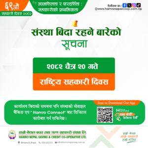 ६९ औँ राष्ट्रिय सहकारी दिवसको अवसरमा संस्था बिदा रहने बारेकाे सूचना ।